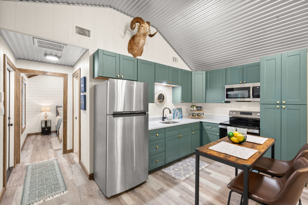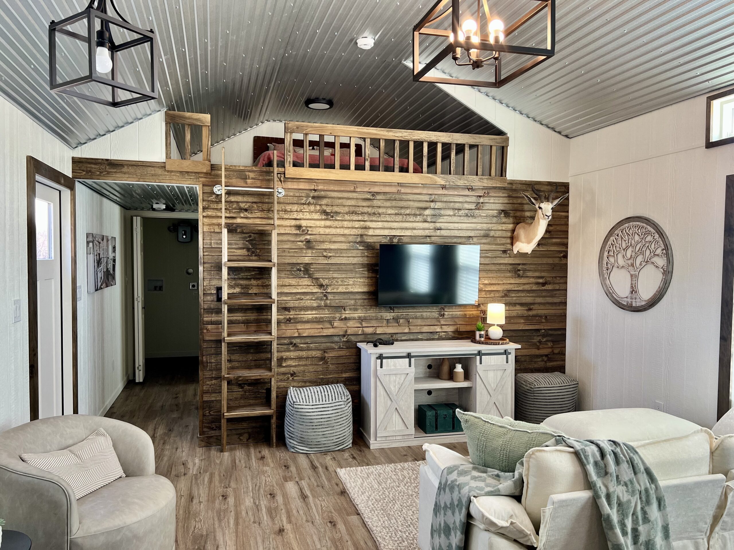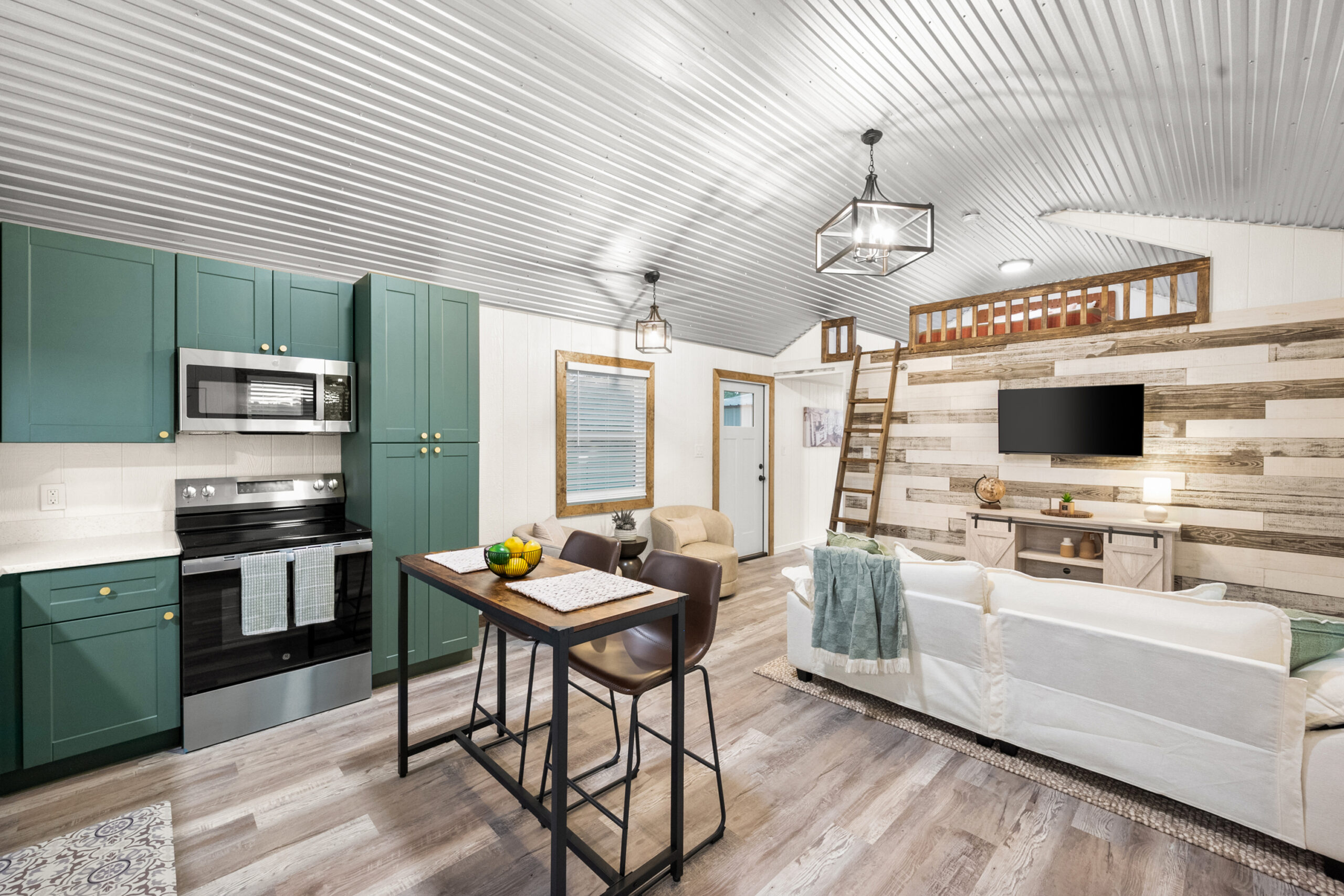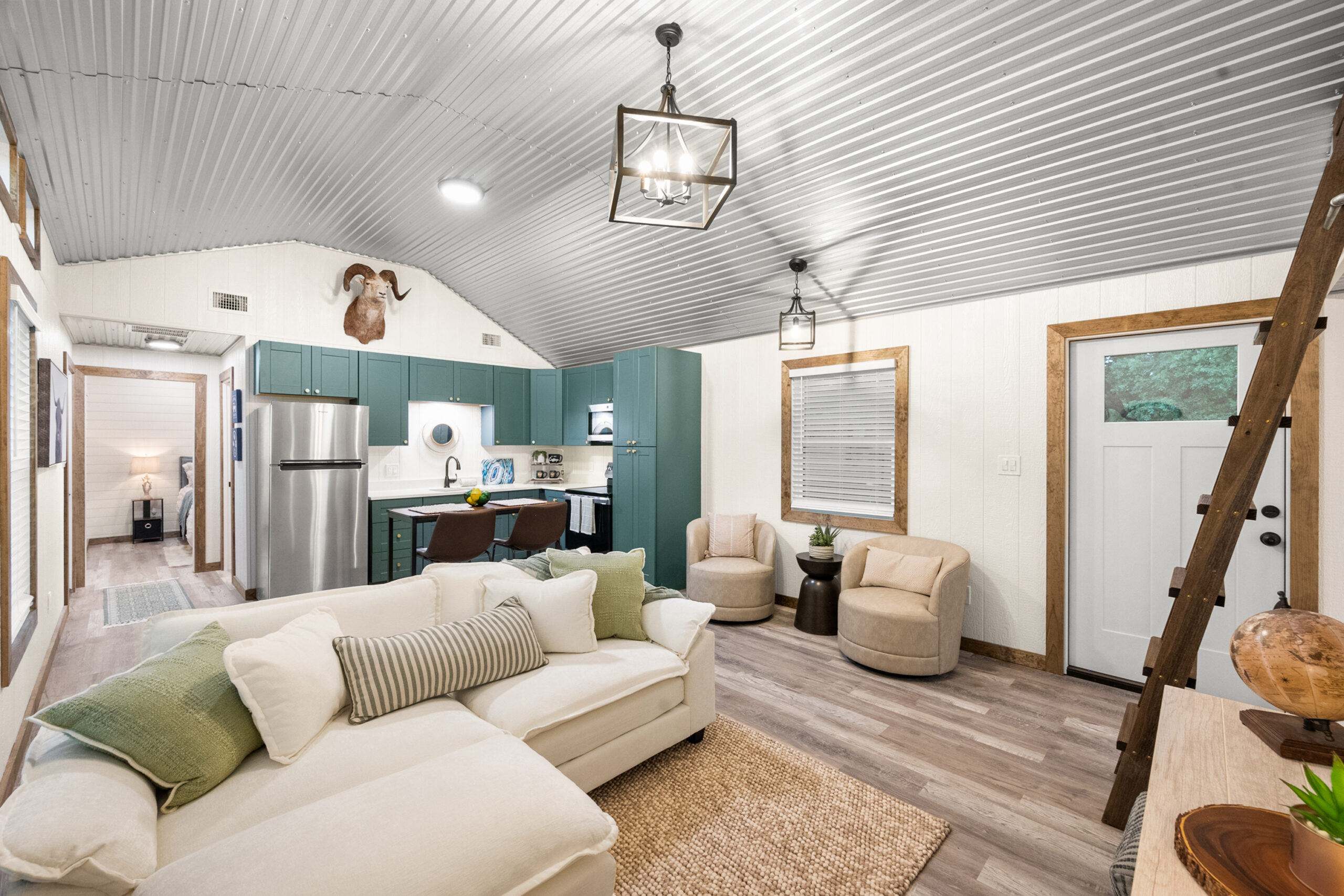 If retreating to your happy place usually includes friends and family, then the Connie Ranch House is calling. Our newest and largest model, ranging from 768 to 1,020 square feet offers two bedrooms, two bathrooms with laundry, 12-foot vaulted ceilings, and an oversized kitchen and living area. The Connie also features both a front and back door, along with a spacious storage area or an optional large storage or sleeping loft. This unique cabin is perfect for a ranch, lake getaway, weekend retreat, full-time residence, or B&B lodging. With lofted windows and tall walls, it creates the ideal atmosphere for fun, games, and unforgettable experiences.